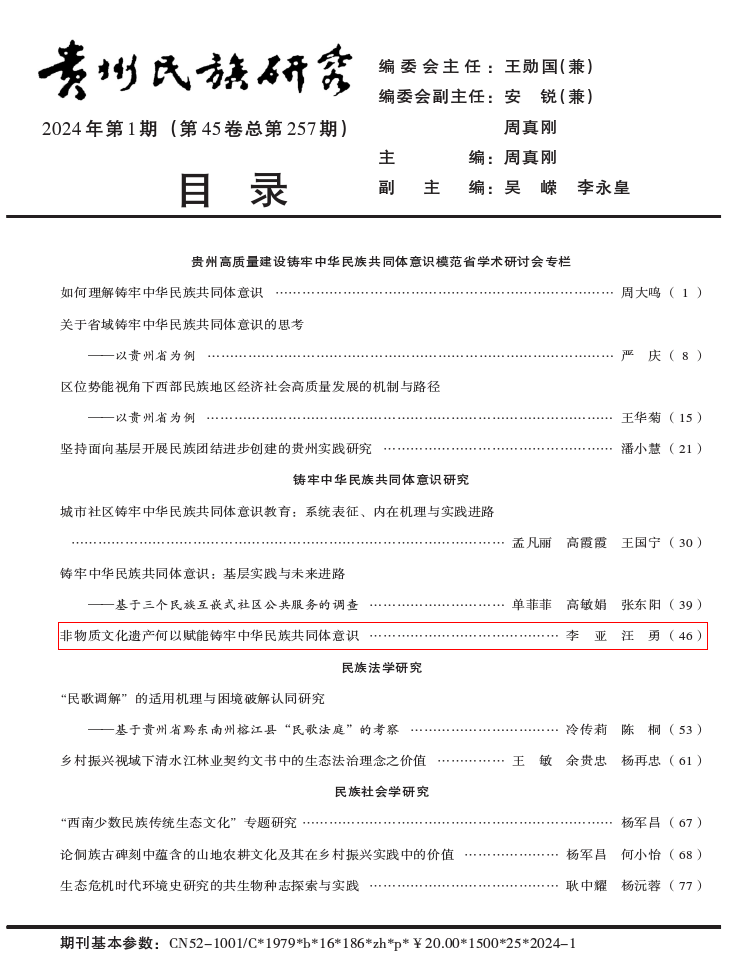 近日,公司李亚老师在《贵州民族研究》(CSSCI来源期刊/北大核心)(2024年第1期)发表学术论文《非物质文化遗产何以赋能铸牢中华民族共同体意识》。文章认为:中国非物质文化遗产是中国各族人民在中华民族多元一体格局下、在长期的历史发展过程中相互作用、相互学习借鉴、相互认同累积形成而又保留各自民族特色的传统文化表现形式及其相关的实物和场所,其中蕴藏着十分丰富的中华民族共同体意识的基因,是铸牢中华民族共同体意识的宝贵资源。中国非物质文化遗产以其承载的共同记忆、共同情感、共同精神,为铸牢中华民族共同体意识奠定了基础;通过唤醒共同身份、强化共同思想、凝聚共同力量,为铸牢中华民族共同体意识提供了方案;凭借其有形载体、有感方式、有效成果,为铸牢中华民族共同体意识指明了路径。