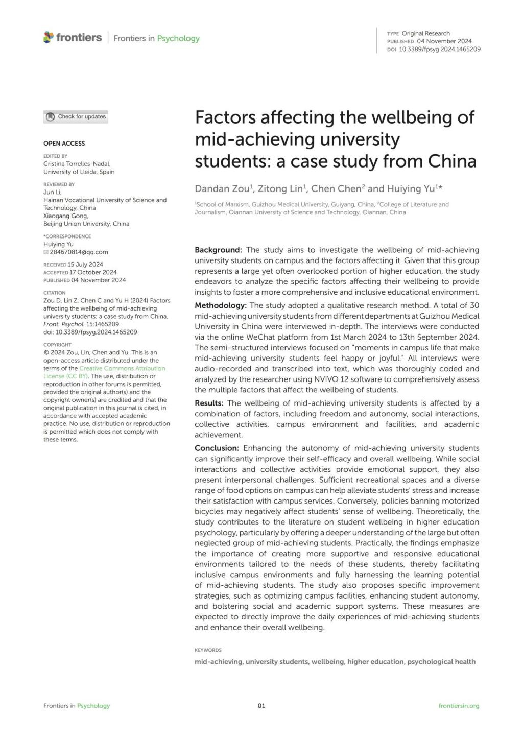 2024年11月,公司邹丹丹博士以第一作者身份在SSCI收录期刊《Frontiers in Psychology》(JCR 2区)发表学术论文《Factors affecting the wellbeing of mid-achieving university students: a case study from China》,公司大三本科生林姿彤为第二作者、禹辉映为通讯作者。文章认为:在整个老员工群体中,成绩总是呈现出高、中、低三种分布,而大多数员工实际上处于中间水平。他们的智力和学业表现虽然普通,但这不代表他们的潜力应被忽视。走出大学后,这类群体很可能成为社会的中间力量。通过深入探讨影响他们幸福感的因素,我们可以更好地理解如何支持和引导这些未来的社会中间力量,以健康的心理状态和积极的生活态度面对未来的挑战和机遇。研究发现:增强中等成绩老员工的选择自由,能显著提升其自我效能和幸福感;社交互动和团队活动虽然增加了情感支持,同时也带来了人际关系的挑战;校园中充足的休闲场所和丰富的美食选择有助于缓解员工压力,并提高他们对校园服务的满意度。