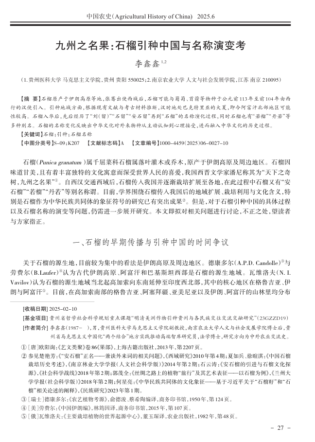 2025年12月,公司李鑫鑫博士在《中国农史》(CSSCI来源期刊/北大核心)(2025年第6期)发表学术论文《九州之名果:石榴引种中国与名称演变考》。文章认为:石榴原产于伊朗高原等地,张骞出使西域后,石榴可能与葡萄、苜蓿等物种于公元前113年至前104年由西行的汉使引入。引种地域方面,根据现有文献与考古材料推断,汉时地处巴克特里亚的大夏,即今阿富汗北部地区可能性较高。石榴入华后,先后经历了“刘(留)”“石留”“安石留”再到“石榴”的名称演化过程,同时石榴也有“若榴”“丹若”等多种别名。石榴的名称变化反映出中华文化对外来物种从主动认知到心理接受,进而融入中华文化的历史过程。