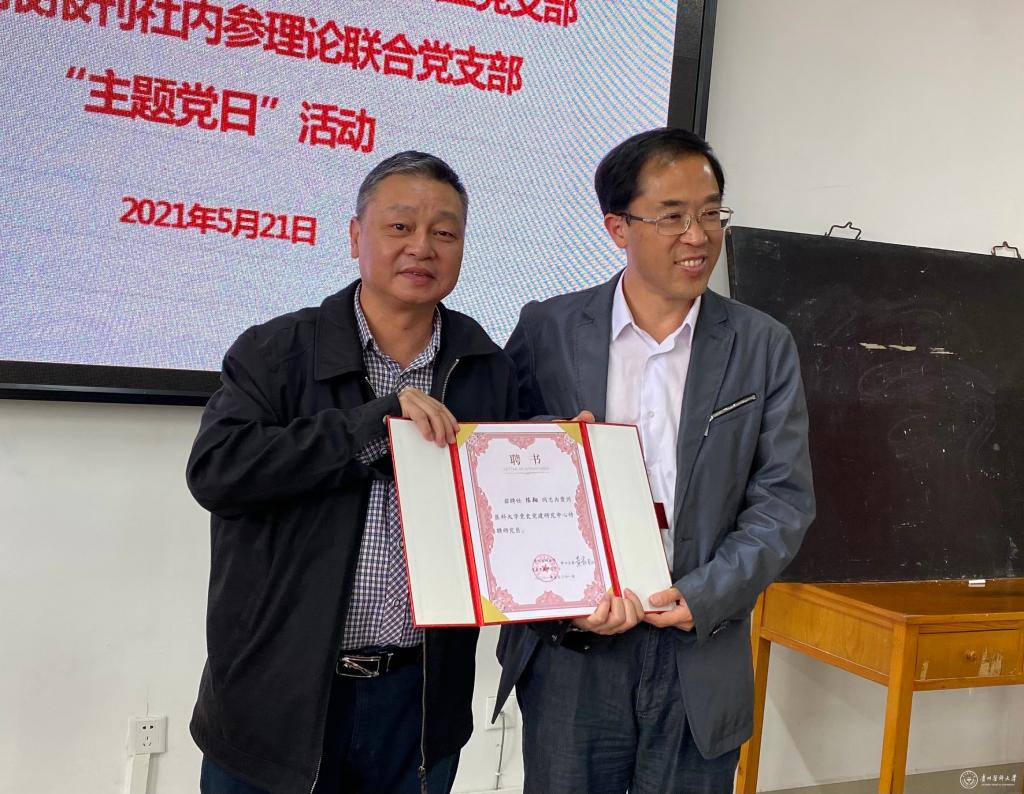 “主题党日”活动中,举行了党史党建研究中心特聘研究员聘任仪式。战勇向陈翔、肖郎平、徐海星3位同志颁发了mksport体育党史党建研究中心特聘研究员聘书,代表学校感谢贵州日报社长期以来对学校的关心与支持,希望贵州日报社继续关注指导MK SPORTS的建设发展。