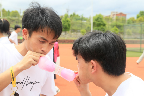 主持人将同学们分成8个小组开展游戏比赛。第一环节是“来去无踪”,即以绳子为纽带,将各组同学的左右脚分别绑在一起,小组成员以共讨论、齐踏步、喊口号等方式开展,到达目的地并返回起点用时最少的小组获胜。各组积极讨论对策,彼此密切配合,全部顺利完成任务。该环节的游戏加强了同学们的团队协作能力,培养了团队精神。第二环节是“薪火相传”,各组同学之间通过默契的配合以及相互的鼓励将杯子放到指定地点,在挑战自己的同时更增强了组员之间互动,拉近了同学之间的距离。第三环节是“心有千千结”,同学们彼此相握,形成“错综复杂的手链”,看似不可解开的结在被解开后才发现,“结”只是在我们的心中,只要我们下定决心解开心结,就一定能够达到目标。