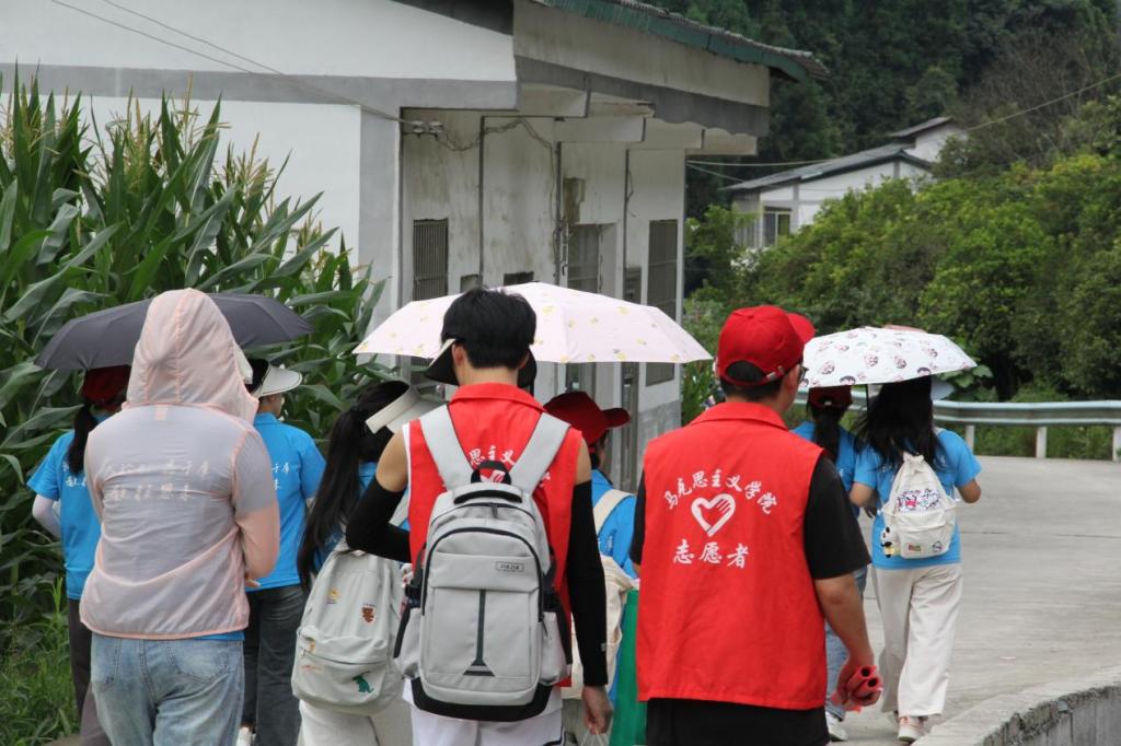 随后,实践队被分为三个小组,深入村民家中访谈,了解当地群众的生活变化情况和对红色文化的认知情况。队员们通过有奖问答环节与孩子们进行交流互动,寓教于乐的同时积极宣传新中国成立75周年以来的伟大成就。如我国神舟十八号载人飞船的成功发射、医疗健康保障的进步等,让村民和孩子们接受红色精神的熏陶,并从中深切感受到在中国共产党的领导下人民生活走上了幸福安康之路、国家走上了繁荣富强之路。同时,宣传活动也将理论知识与社会实践紧密结合,提升了实践队员的社会责任感和实践能力。