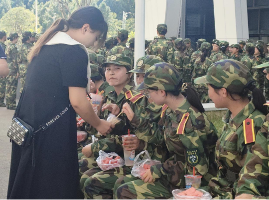 王万江详细了解员工的身心状况和受训情况,对承训教官的辛苦付出表示感谢。学院老师和员工会成员将柠檬水和西瓜分发到每一位新生手中。