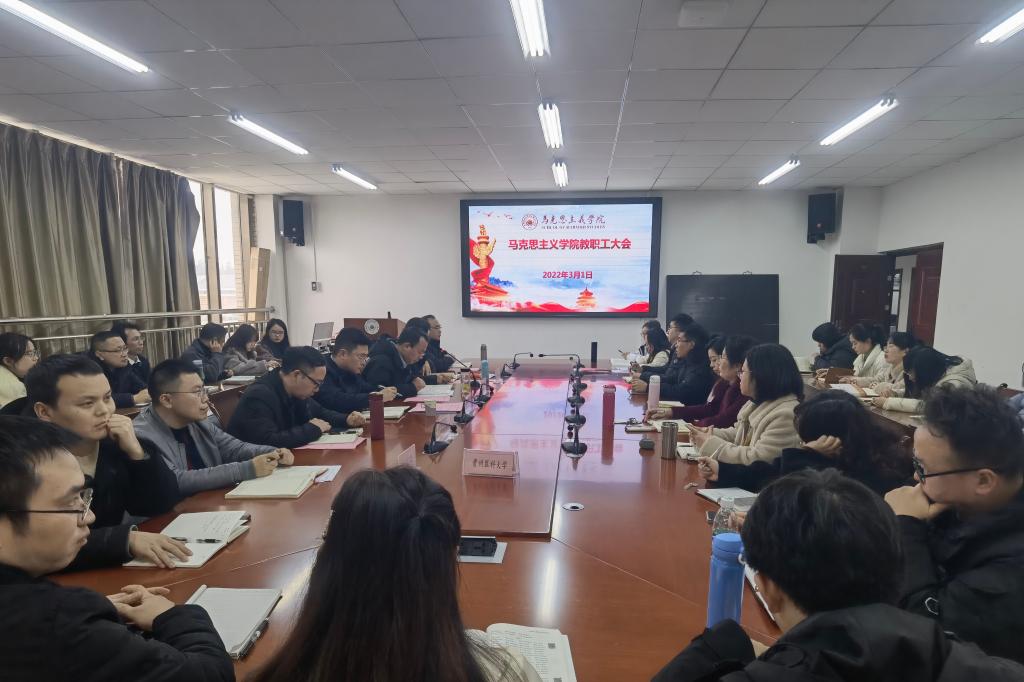 黄鑫权总结了去年工作,学院在对外交流合作、平台建设、科研项目申报、人才引进、教材编撰、教学竞赛等方面取得了令人瞩目的成绩,离不开学校的支持和全院师生的共同努力。他指出学院今年的工作规划:一是把牢政治方向,守好意识形态阵地;二是传承马院优良传统,抓紧抓好教学工作;三是抢抓后发机遇,补齐科研短板;四是加强学科和平台建设,筑牢跨越发展根基。黄鑫权强调,今年是申建省级重点马院的关键之年,也是团队建设的关键节点,全体教职工要凝心聚力,努力奋斗,以饱满的热情、充足的精力做出成效。